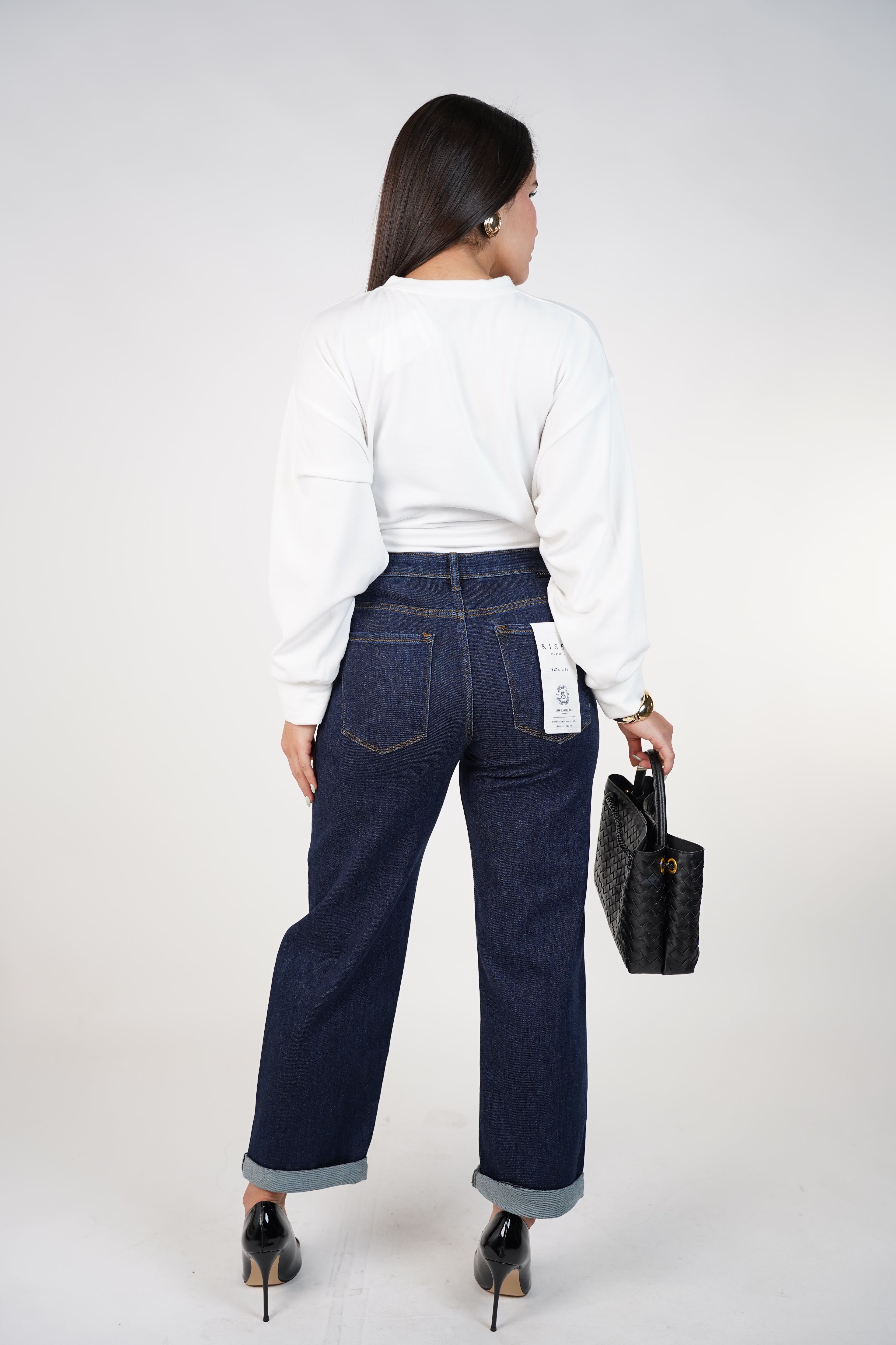 Shop the Velysse Slouchy Boyfriend Jeans featuring a relaxed straight-leg fit, cuffed hems, and classic dark wash. A timeless denim essential for everyday styling.