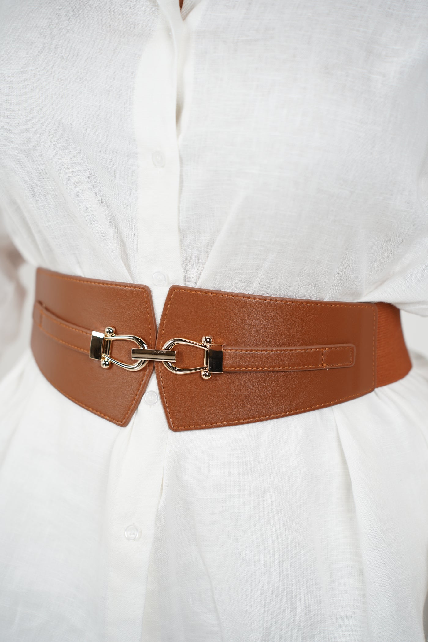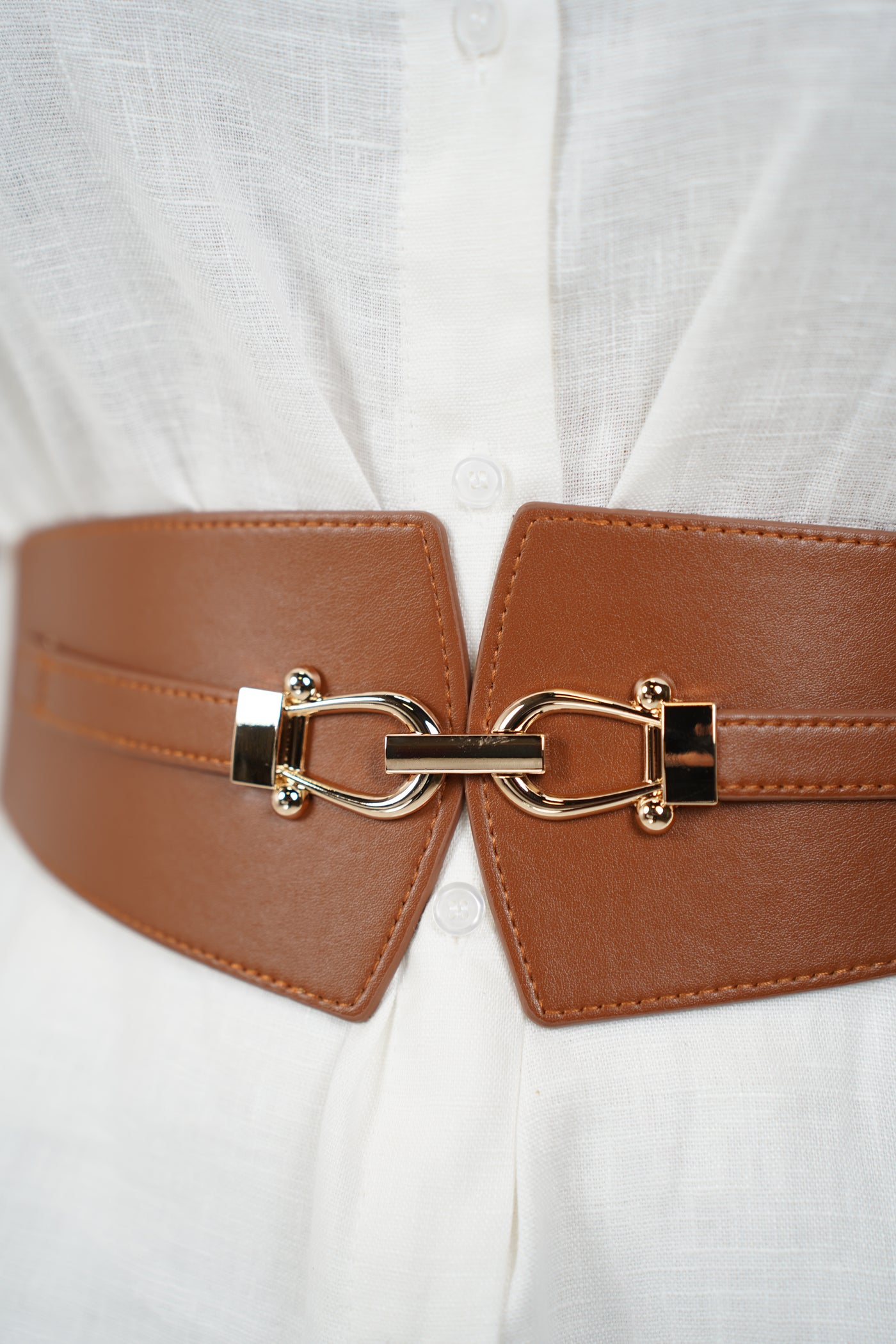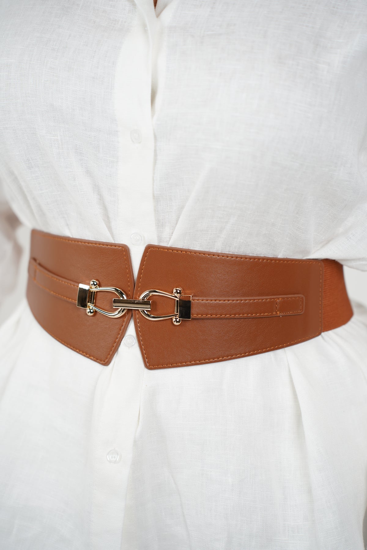 Veyra Horsebit Leather Belt – camel brown faux leather belt with gold horsebit closure on white blouse