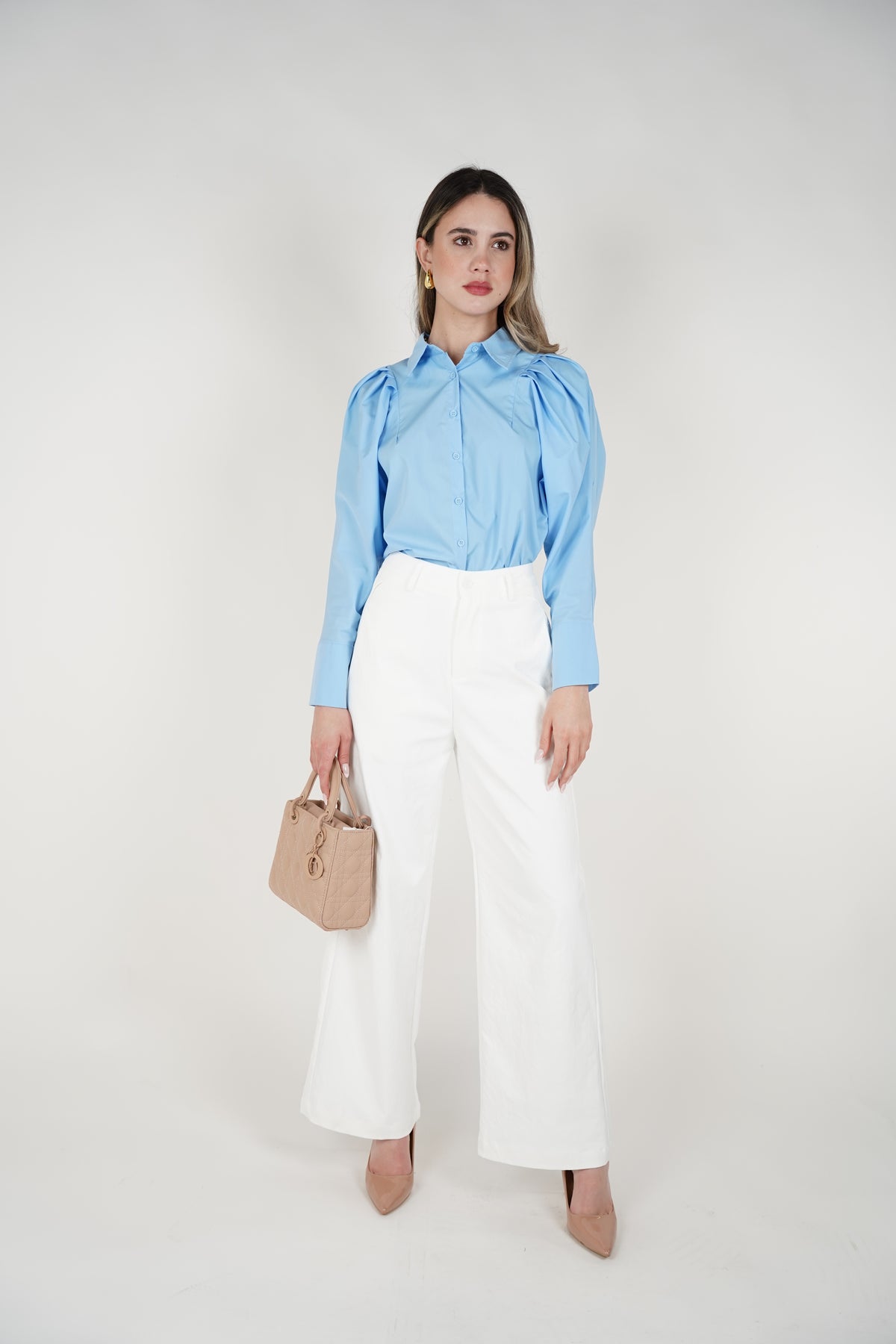 Shop the Viera Wide Leg Trousers – elegant white high-waisted pants with a wide leg silhouette. Modern, refined, and timeless from Carema Boutique.