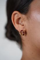 Close-up of red and gold knot stud earrings worn on model’s ear.