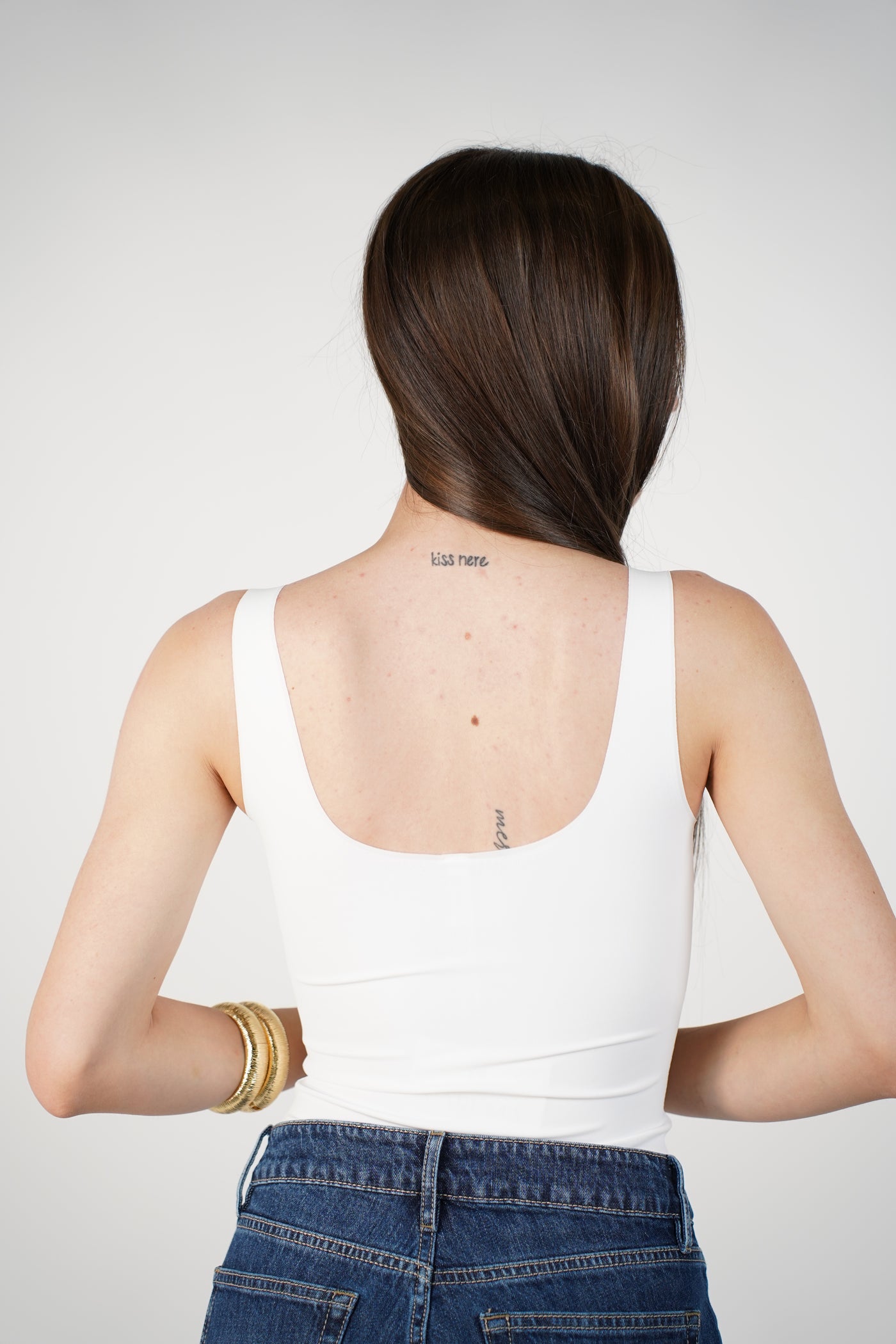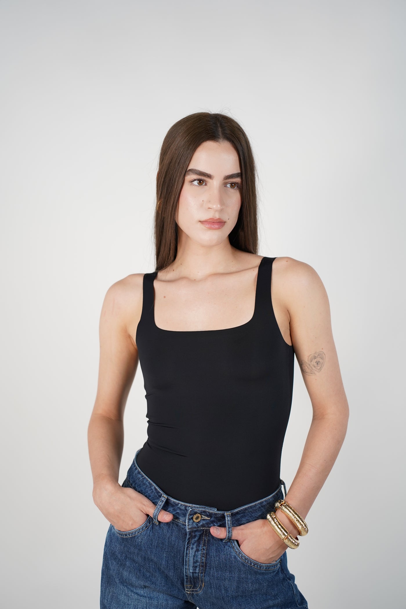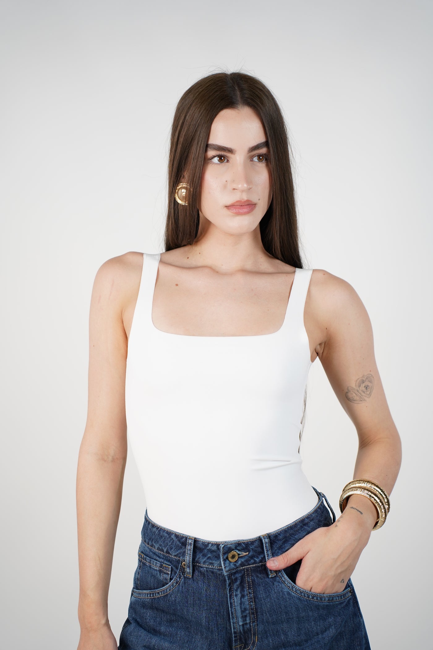 Woman wearing nude square-neck seamless bodysuit with brown pants and gold earrings.