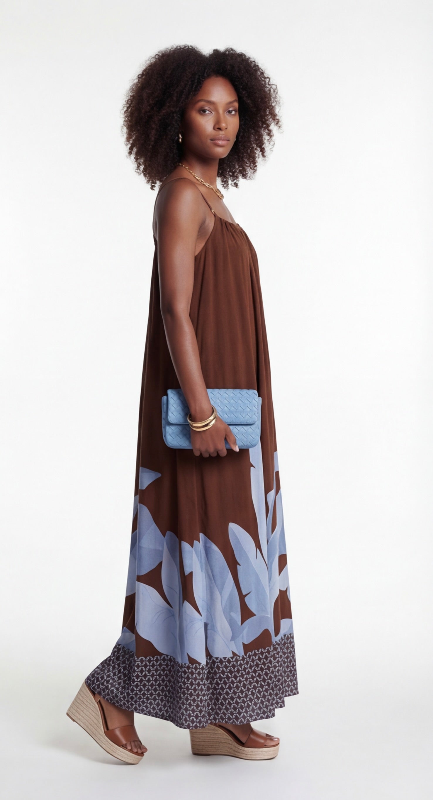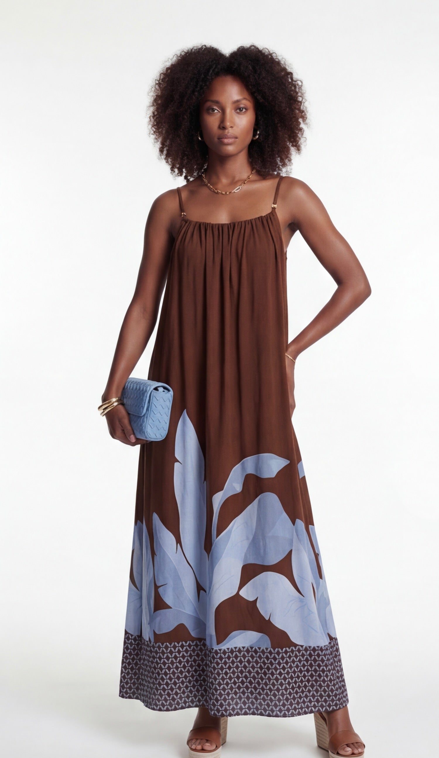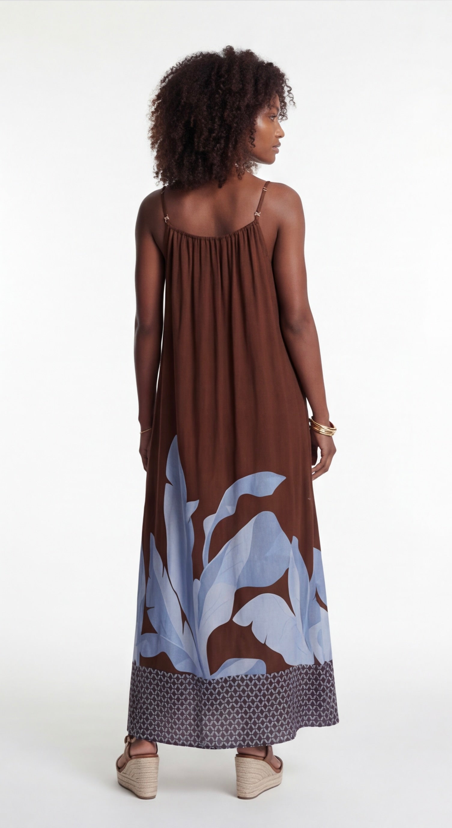 Model wearing brown maxi dress with light blue botanical print, strappy shoulders, and relaxed flowing silhouette.